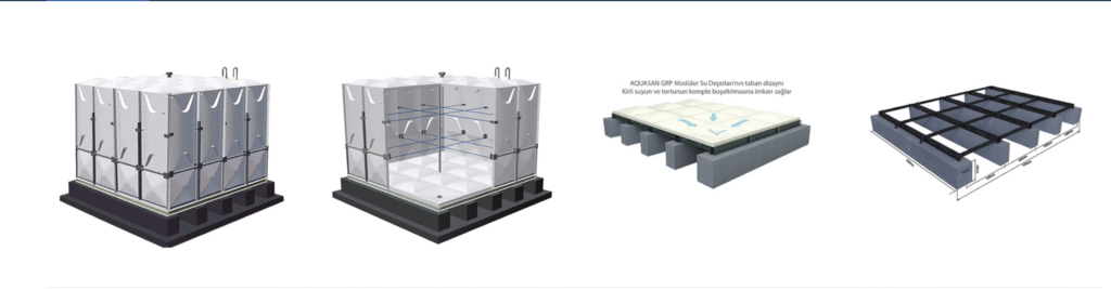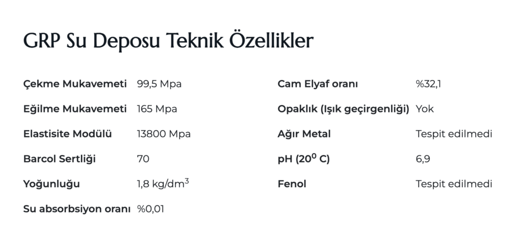 • GRP depoların ham maddesi kırpılmış cam elyaf ve doymamış polyester reçinedir. GRP Paneller sıcak presleme ile üretildiğinden çok mukavemetlidir. Uzun ömürlü olup minimum ömrü 50 yıldır.